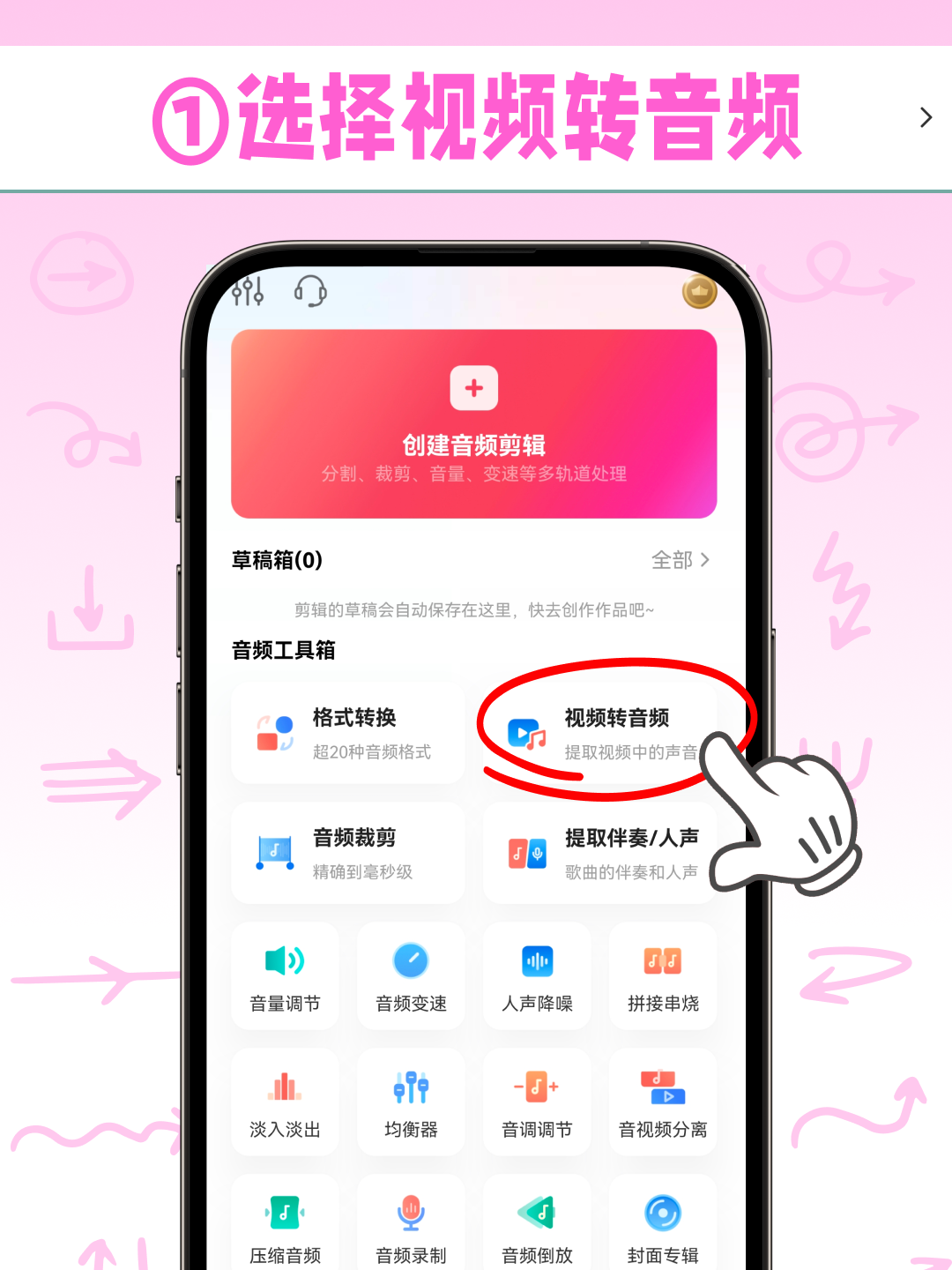 mp4转mp3音乐视频提取音频手机教程当我们需要把一些视频的音乐或者声音提取出来的时候总是找不到合适的工具 剪辑软件又很复杂,不能单独导出mp3音乐 网课啊,剪辑啊都需要用到这个功能 今天给大家介绍一下我们软件的提取音频功能, 只需要三步就可以轻松提取视频中的音乐 第一步:打开软件,选择提取音频