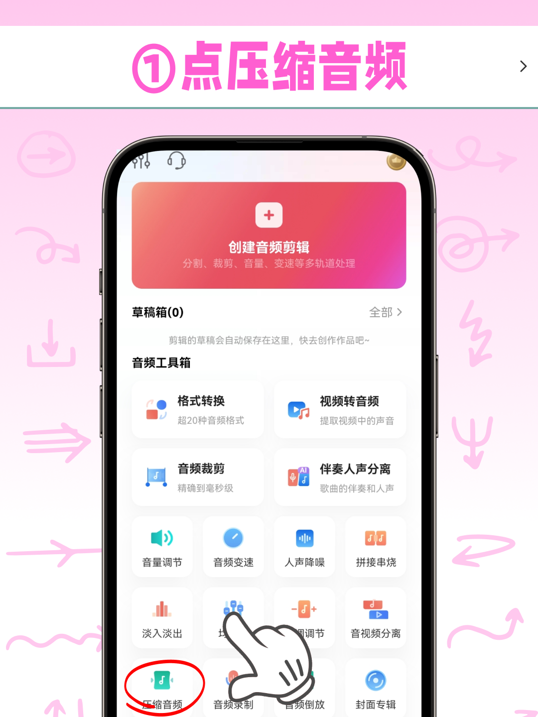 1️⃣打开手机上保存好的音频压缩工具【音频快剪】,点【压缩音频】功能选项